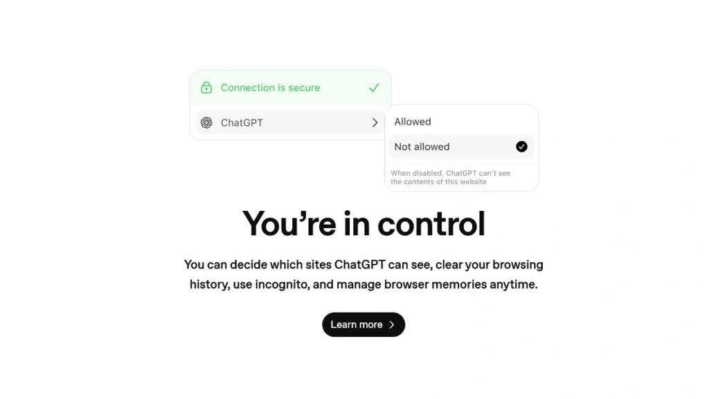 Users can enable or disable browser memory (past browsing history access) and block ChatGPT from specific sites.