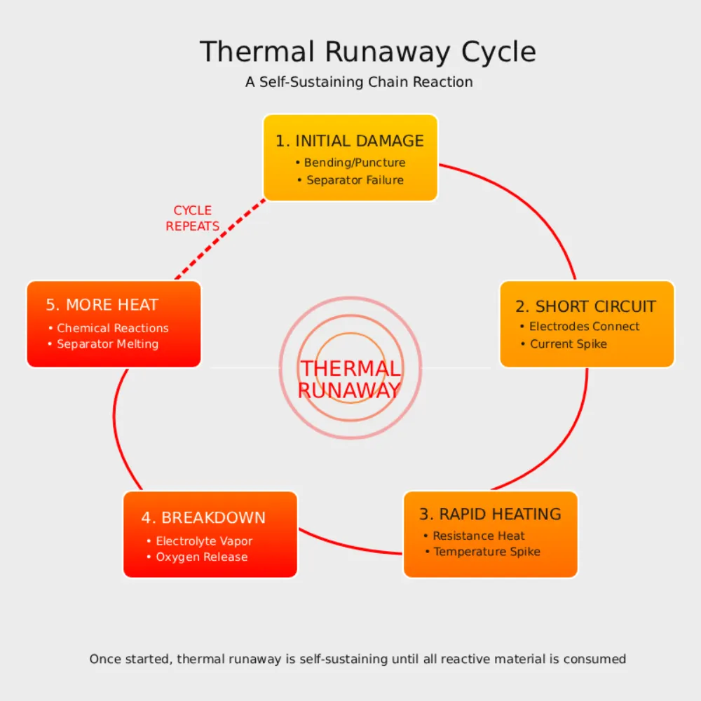 The cathode material begins breaking down, releasing oxygen. Now you have fuel (electrolyte vapors), heat (from the short circuit), and oxygen (from decomposing cathode). That’s the fire triangle, all contained inside a sealed aluminum pouch.
